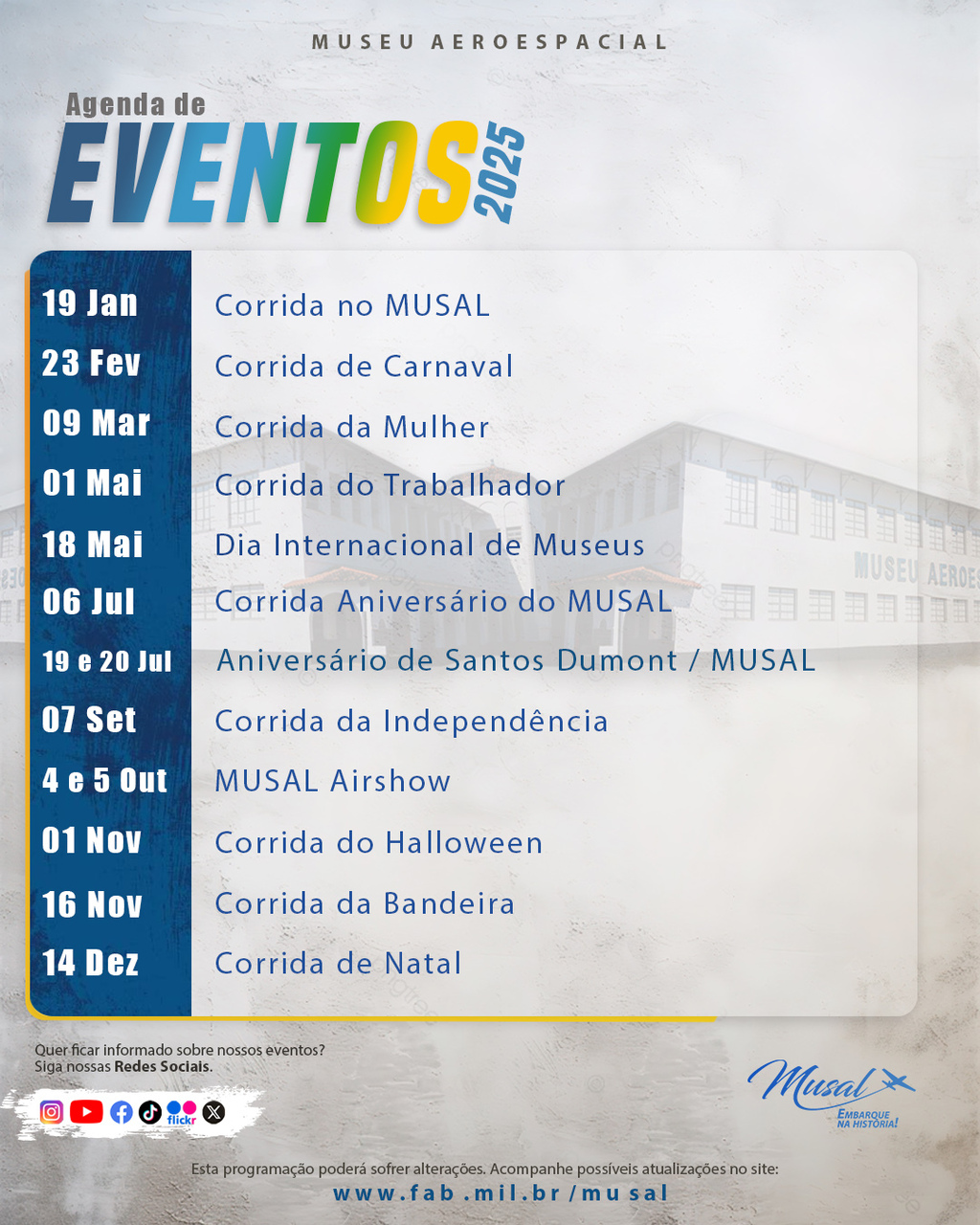 Além dos eventos agendados, o Museu Aeroespacial ocasionalmente promove outros eventos ao longo do ano. Fique de olho em nosso site e siga o MUSAL nas redes sociais para manter-se informado(a) e verificar possíveis alterações na programação!